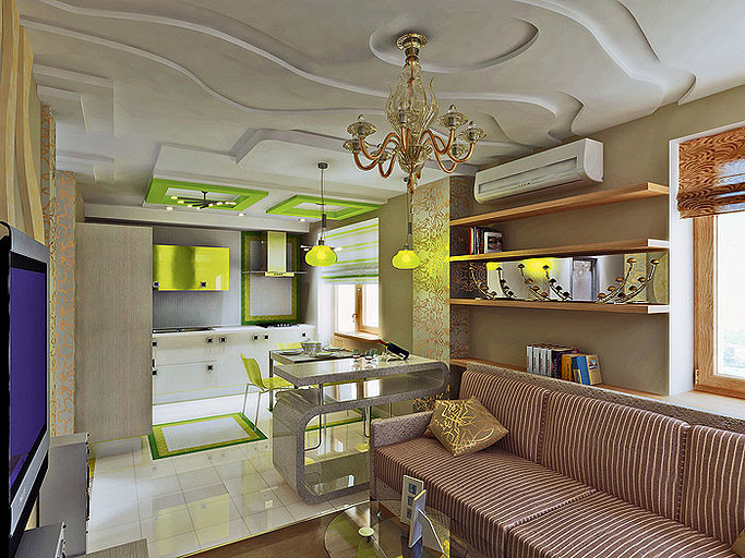 Перепады высоты потолка (до 100мм) созданы за счет крепления нескольких слоев ГКЛ без профиля. Высота рельефа с плавными очертаниями- 24мм