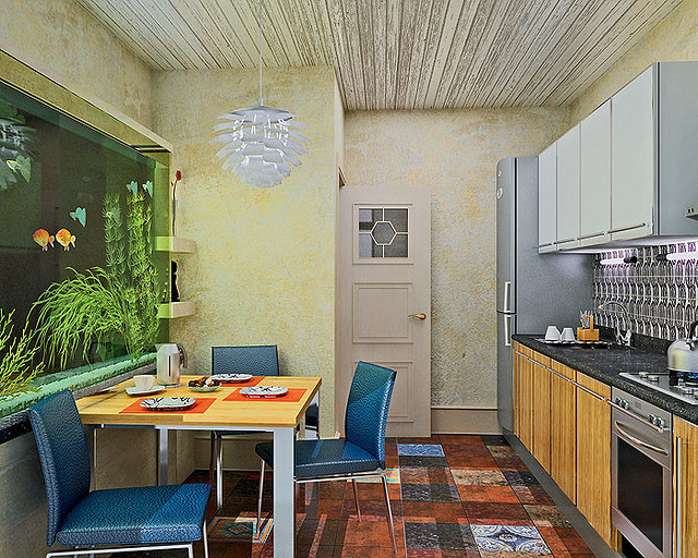Подсветка аквариума может служить дополнительным локальным источником освещения для обеденной группы