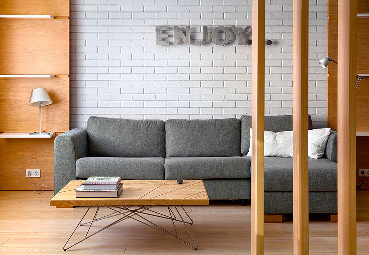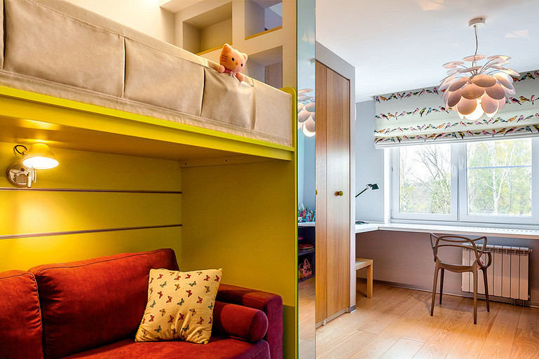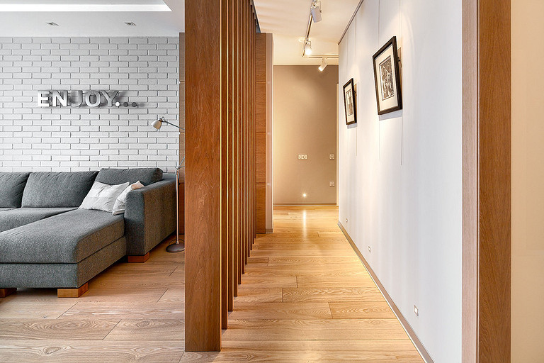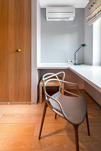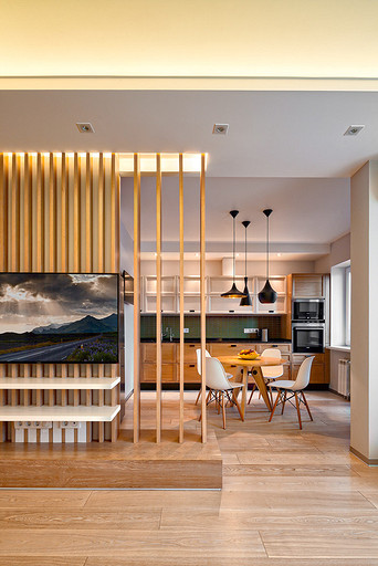 Дом, в который переехала молодая семейная пара с ребёнком, расположен в подмосковном Долгопрудном. Архитекторы создали современный, динамичный интерьер, основанный на использовании светлых натуральных материалов, преимущественно дерева. Спокойную цветовую гамму «взрывают» яркие и смелые авангардные акценты.