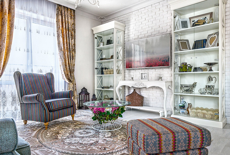- Мебель: диван, кресло, пуф Sits, стол обеденный J-Line, стулья обеденные Poleta, консоль в зоне ТВ, стеллажи «Балтийский Теремок»