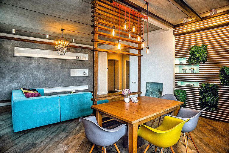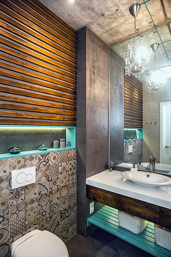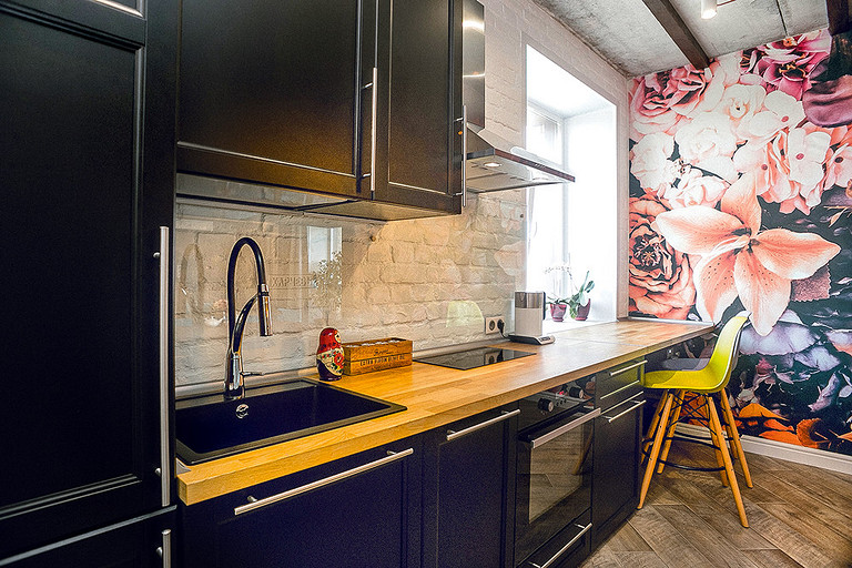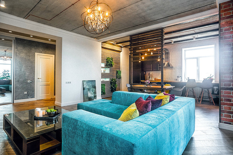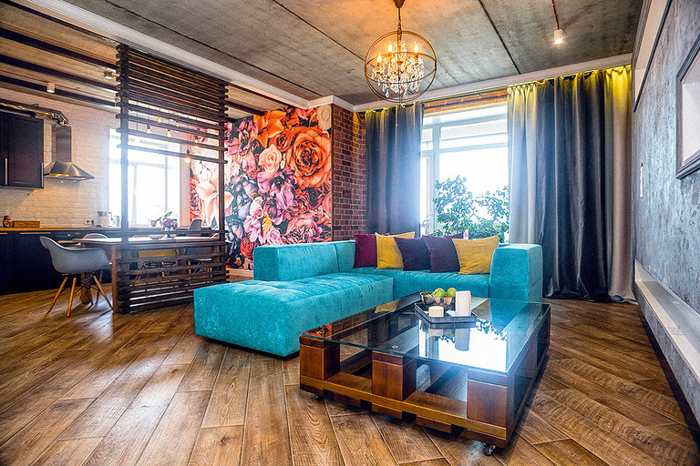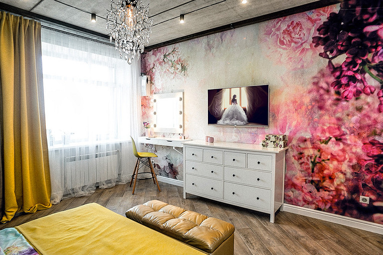 В гармоничном интерьере новосибирской квартиры cочетаются взаимоисключающие стилевые приёмы. Так, бетонные потолки с открытой электропроводкой соседствуют с «розарием» на фотообоях и декорациями, которые напоминают садовые перголы, а «голые лампочки» креативного светильника — с гламурной люстрой, мерцающей хрустальными подвесками.