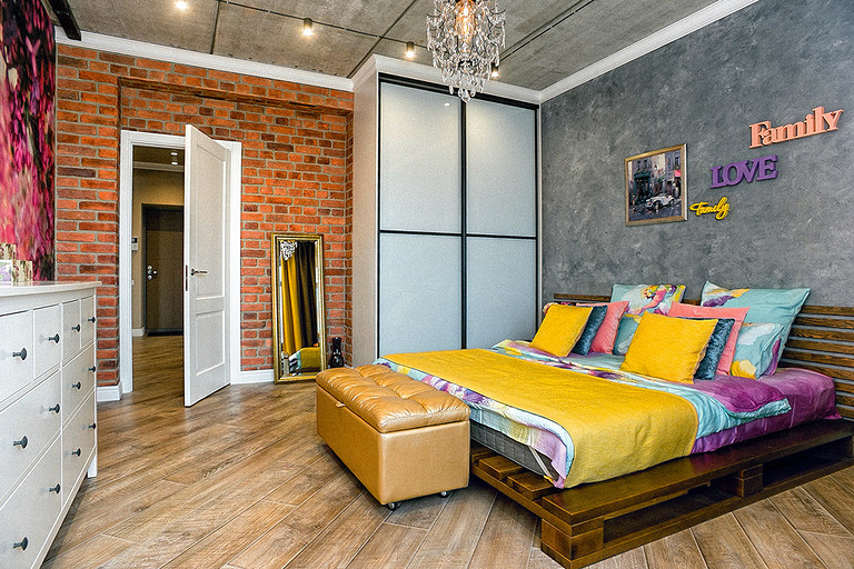 • Стены: кирпич Pixel-wood, штукатурка декоративная Derufa, фотопанно Shutterstock, стекло в металлических рамах Erfurt, стекло в металлических рамах Erfurt, стекло в металлических рамах Erfurt