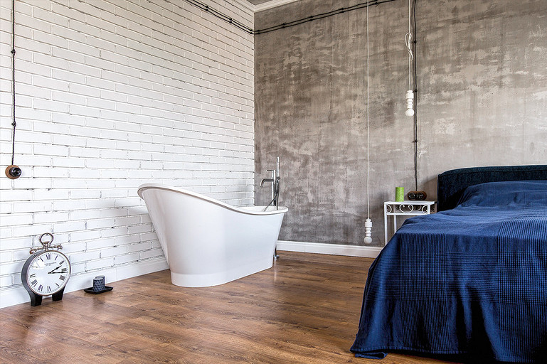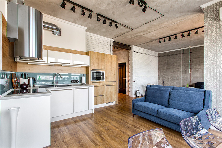 Супружеская пара обратилась к дизайнерам с просьбой спроектировать в небольшой квартире в новостройке кухню, спальню, гардеробную и ванную, сохранив изначальную планировку студии. Главное пожелание заказчиков — использовать в интерьере актуальные приёмы лофта и фактуру строительных материалов.