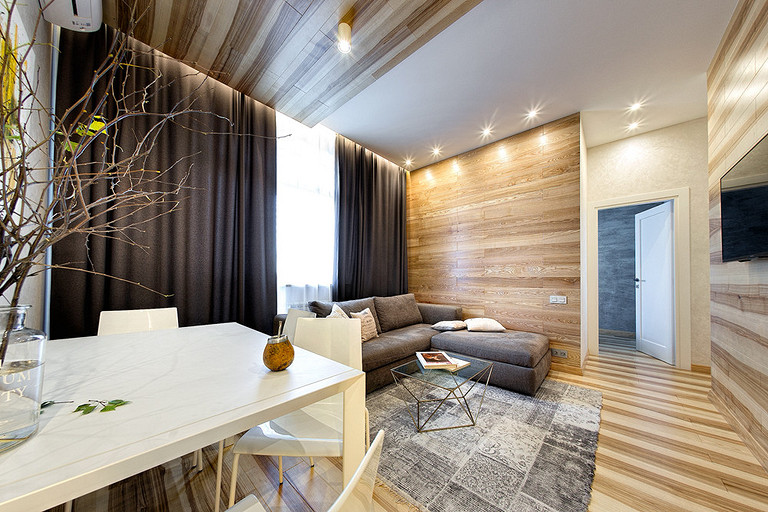 - Мебель: диван Alf Italia, стол журнальный Zara Home, стол обеденный Cattelan Italia, стулья Midj
