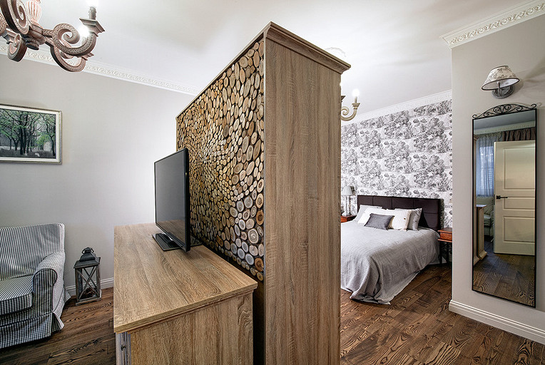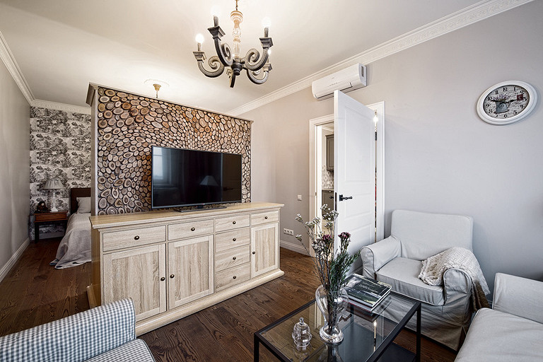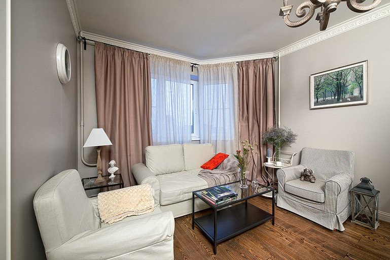В этой небольшой однокомнатной квартире применено нескольно интересных дизайнерских решений, например, гостиная и  спальня разделены с помощью шкафа. За основу взят стиль прованс.