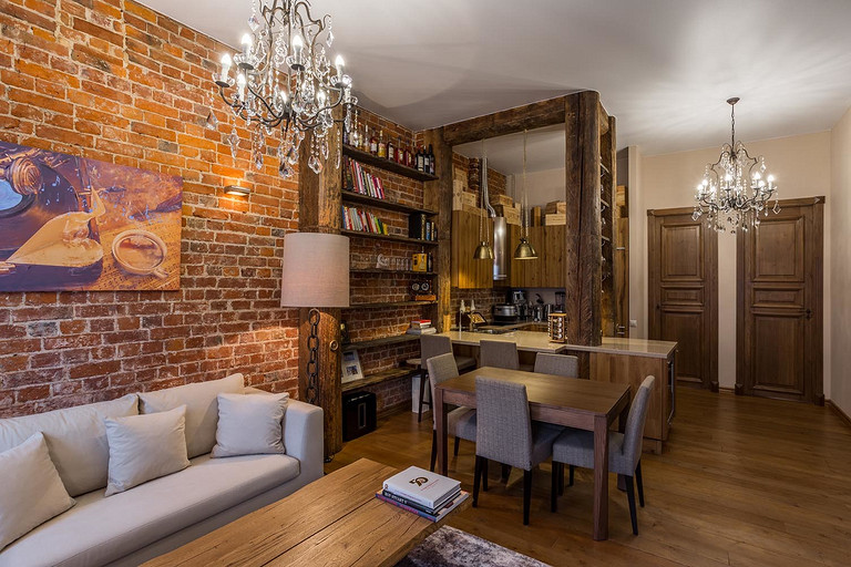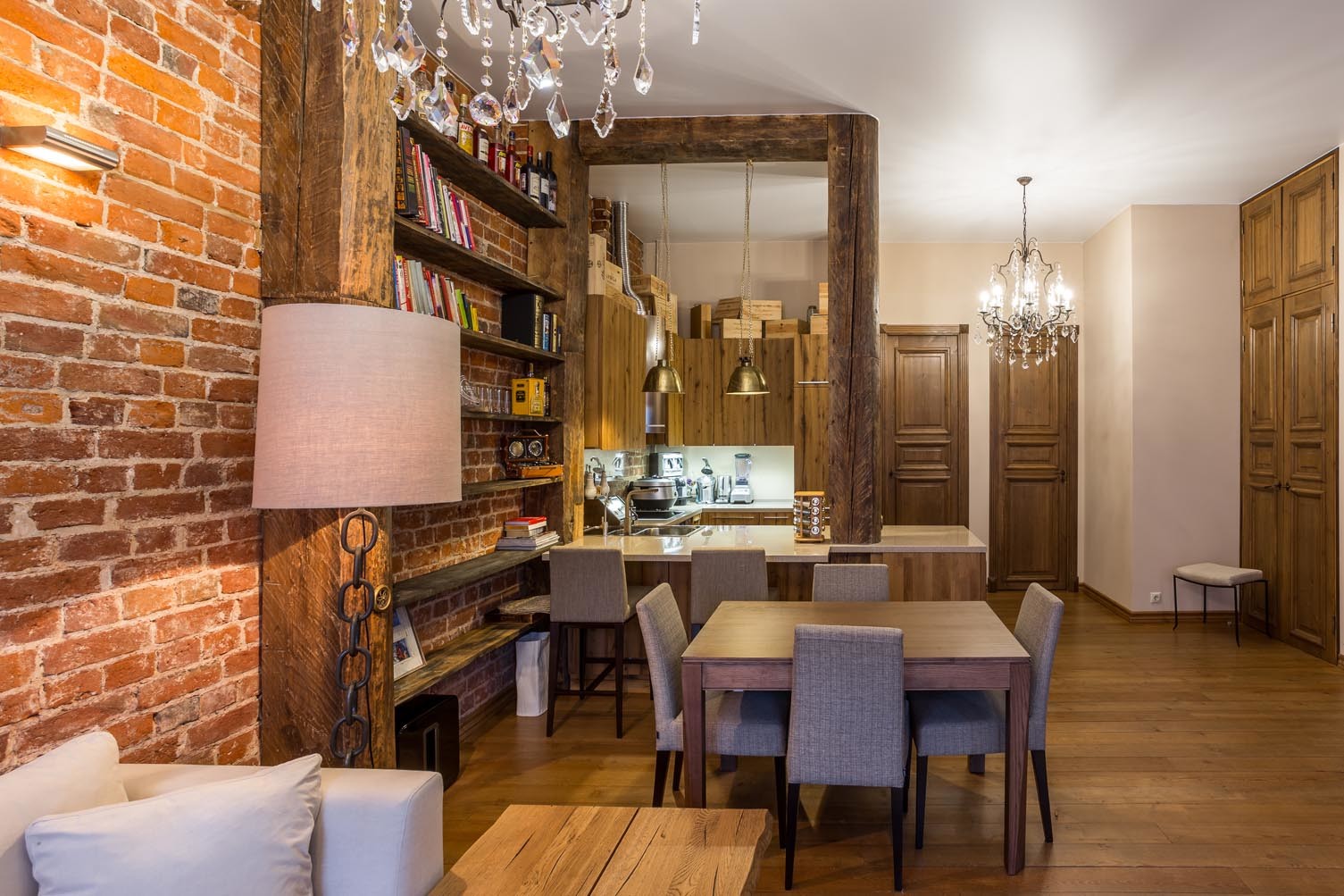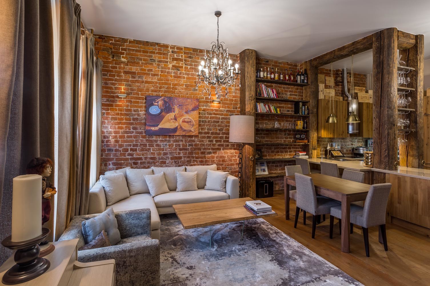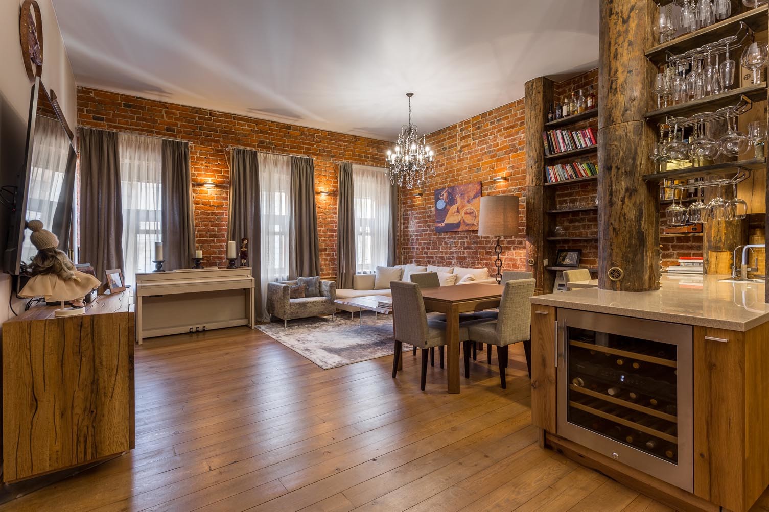 Старый дом с кирпичными стенами, высокими окнами и потолками — настоящая находка для тех, кто ценит красоту природных материалов и эстетику лофта.