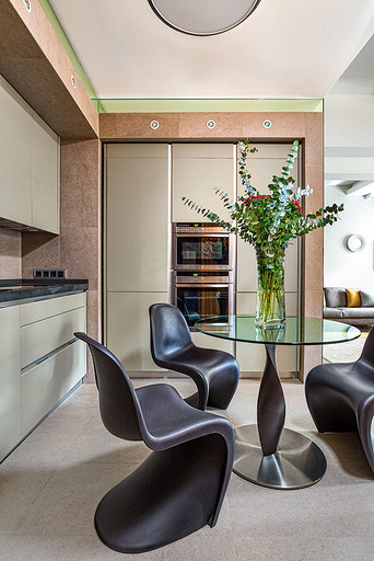 - Мебель: кухня SNAIDERO, столешница, полки — сланец «Студия камня», стол Spin