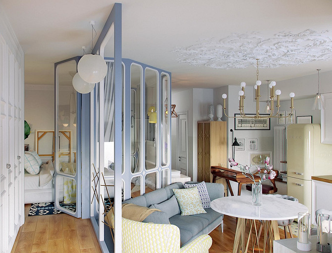С помощью подиума и частично остеклённой перегородки удалось выделить пространства спальни, кухни и гостиной, найти место для мини-кабинета, также в квартире появилась изолированная детская.