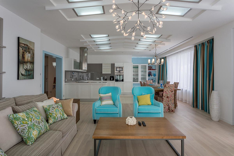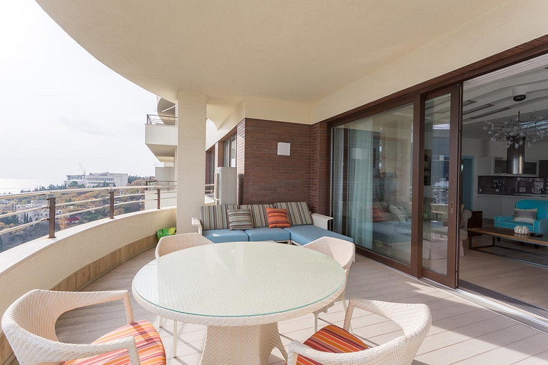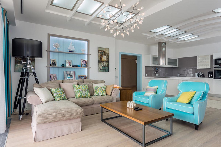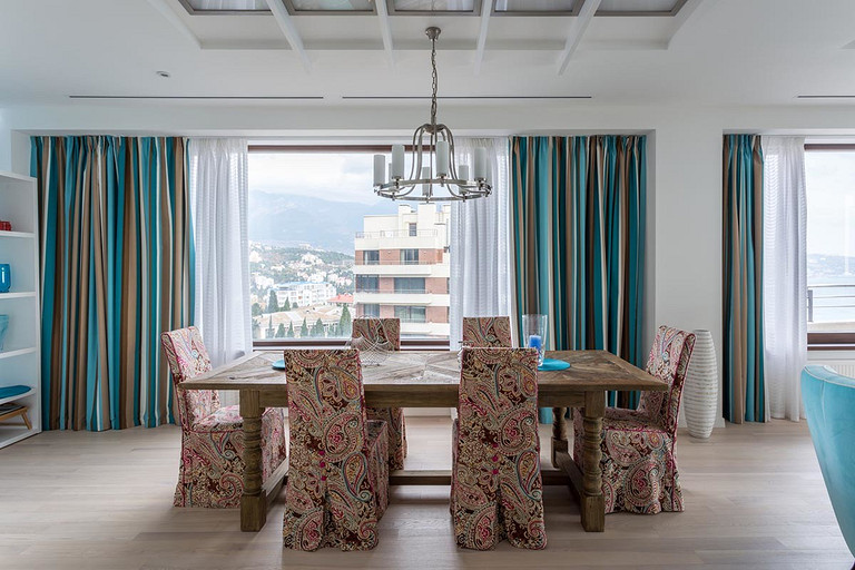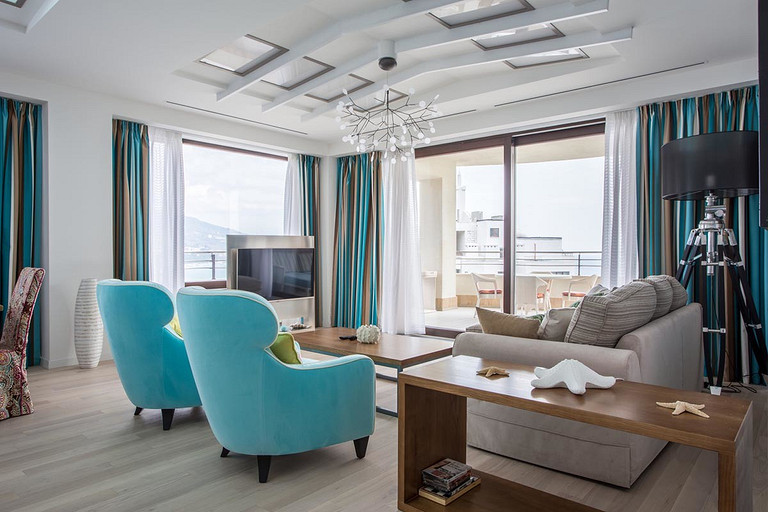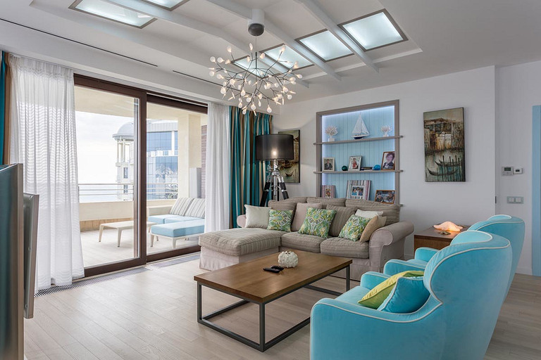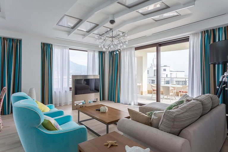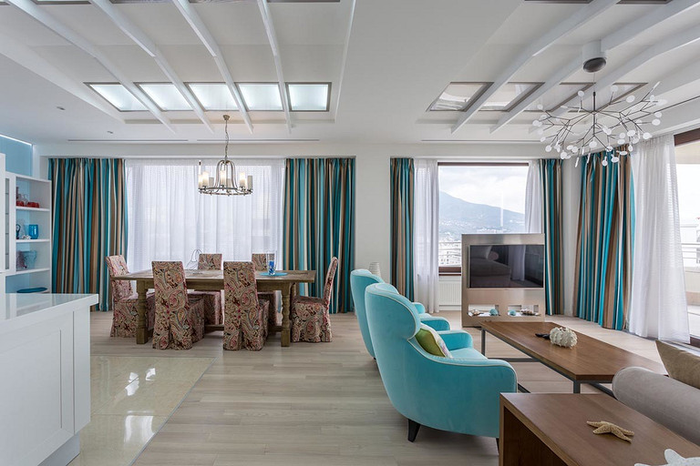 Кажется, что интерьер ялтинской квартиры и пейзаж с видом на море за большими окнами продолжают друг друга и шелест волн о гальку проступает сквозь прохладную палитру дизайна.