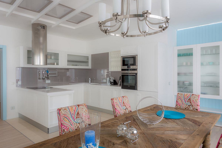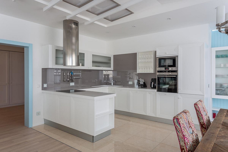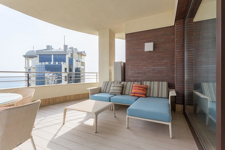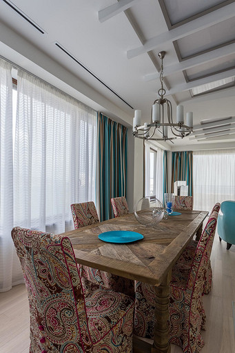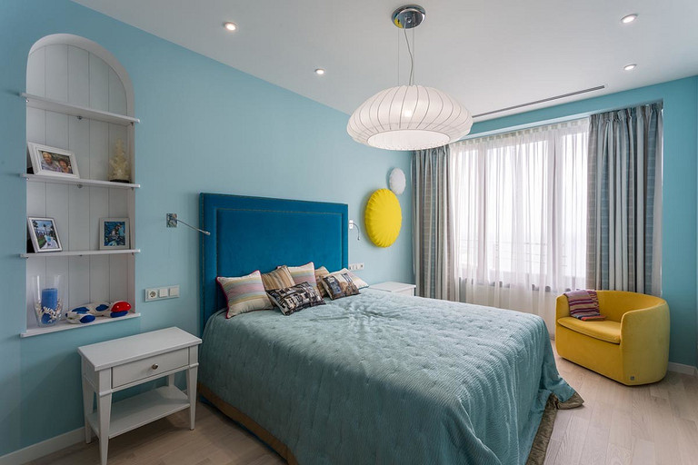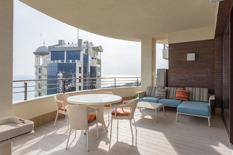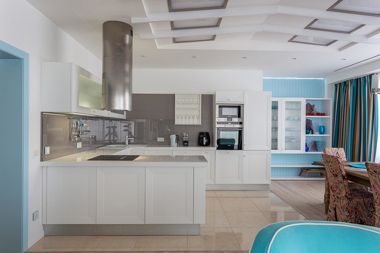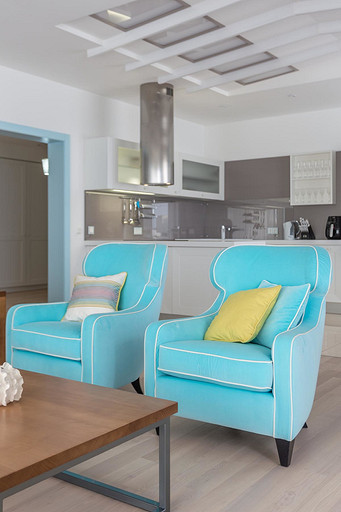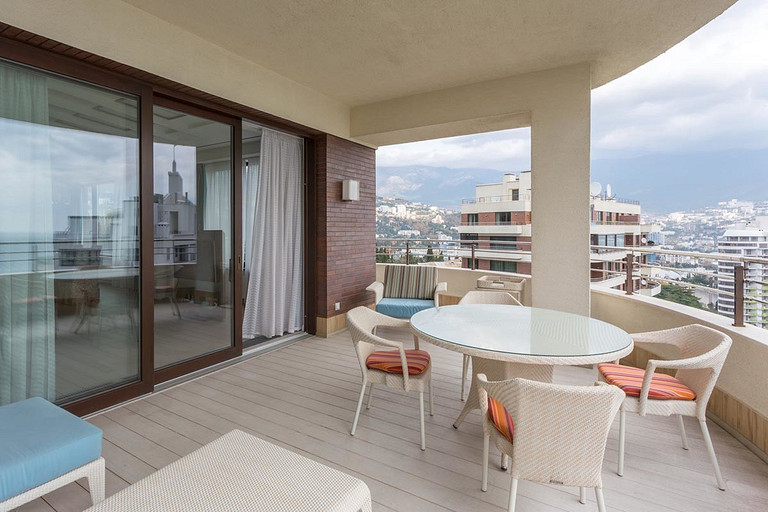 Кажется, что интерьер ялтинской квартиры и пейзаж с видом на море за большими окнами продолжают друг друга и шелест волн о гальку проступает сквозь прохладную палитру дизайна.