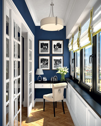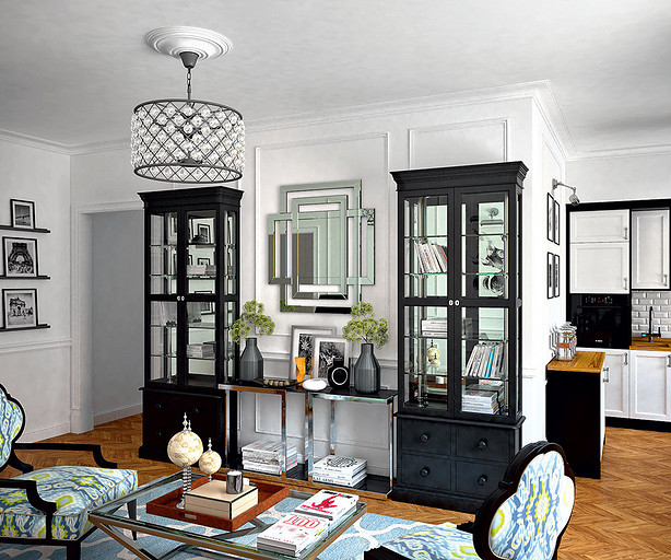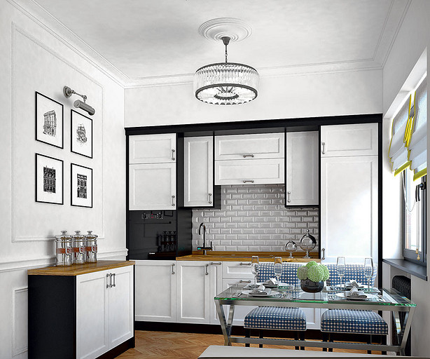 Трёхкомнатная квартира решена в стиле контемпорари. Интерьер построен на контрасте классического белого фона стен с фигурными молдингами и тёмных предметов обстановки, отличающихся лаконичностью форм и строгой геометрией линий.