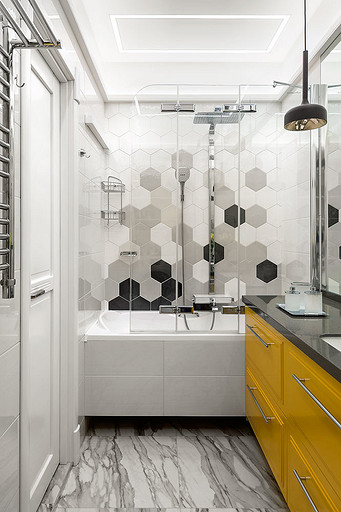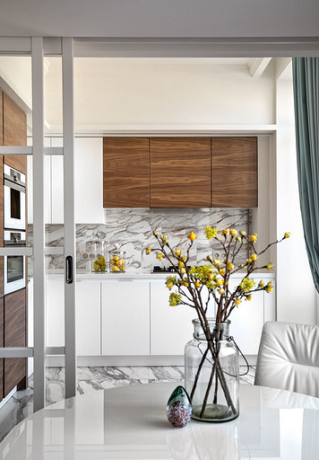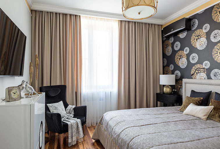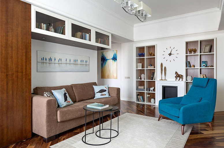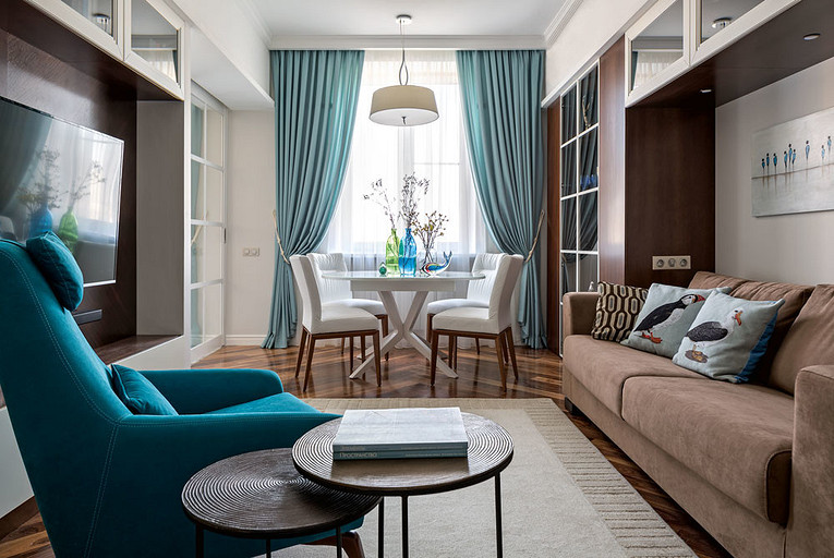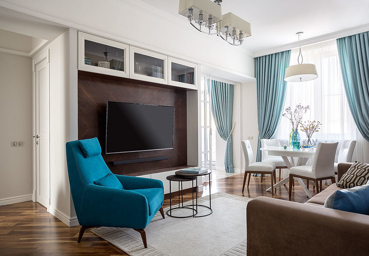 Молодая пара мечтала жить в современном, но не теряющем актуальности интерьере. Для решения этой задачи дизайнер соединила в пространстве стиль контемпорари с элементами классики и дополнила оформление звучными оттенками мёда и лазури.