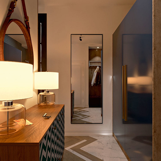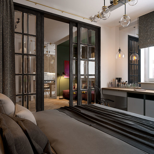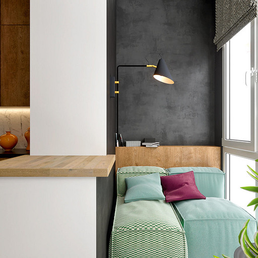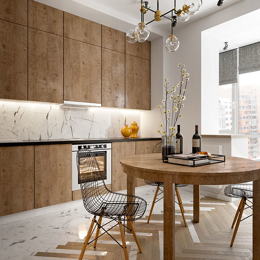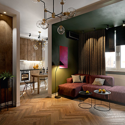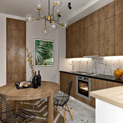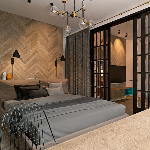 Благодаря незначительной перепланировке в квартире сохранились основные зоны (кухня, гостиная, спальня, ванная) и добавились новые (рабочее место, гардеробная, чилаут). Для оформления интерьера был выбран современный стиль с элементами лофта и midcentury modern.