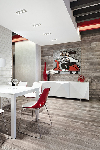 Отправной точкой в дизайне этого пространства стали картины балийского художника, в которых лаконичная серо-бело-чёрная цветовая гамма разбавлена ярко-красными акцентами.