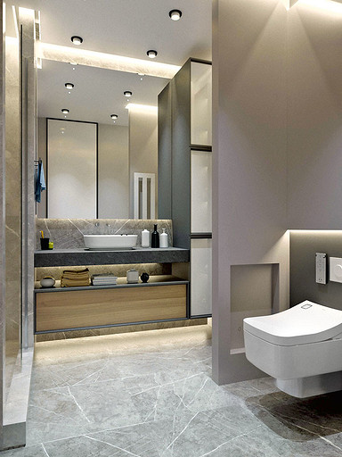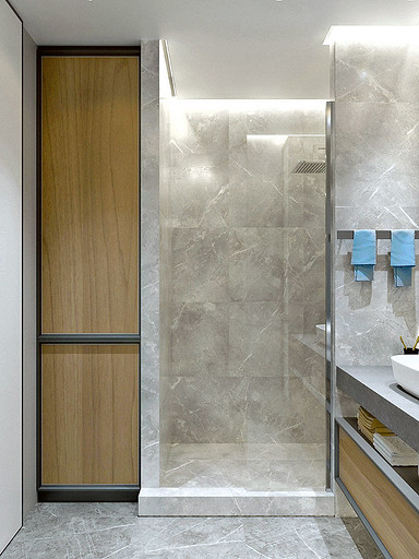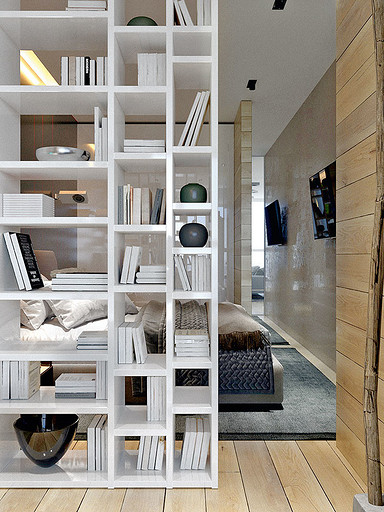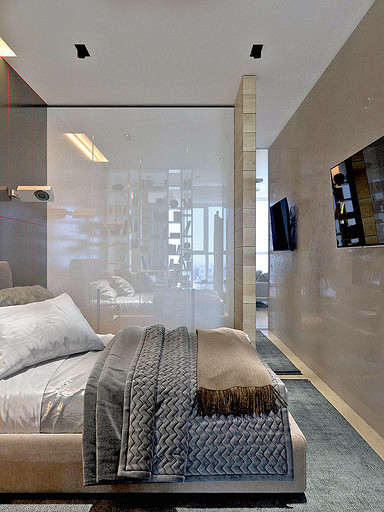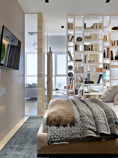 Авторы проекта преобразуют апартаменты свободной планировки в функциональную студию с отдельным приватным блоком, просторными санузлом и гардеробной. Эстетика оформления — современная, лаконичная, без лишних декоративных деталей.
