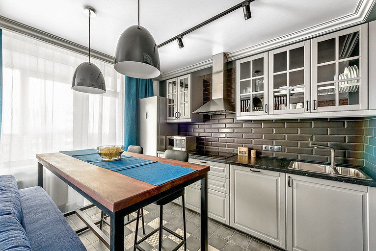 - Мебель: кухня IKEA, барный стол Frugg Hand Craft, стулья барные Frugg Hand Craft