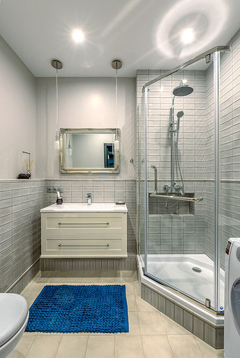 - Сантехника: смеситель VitrА, душевое ограждение RGW, душевой гарнитур Brawat, унитаз навесной VitrА