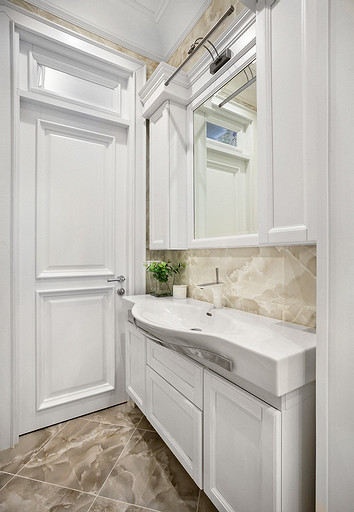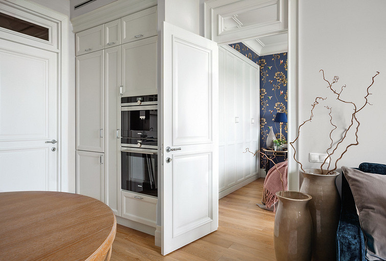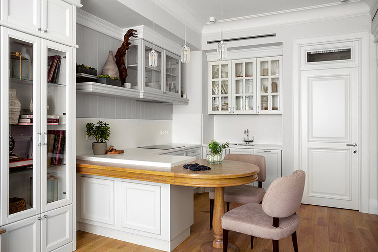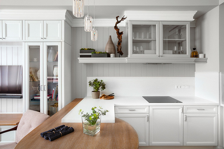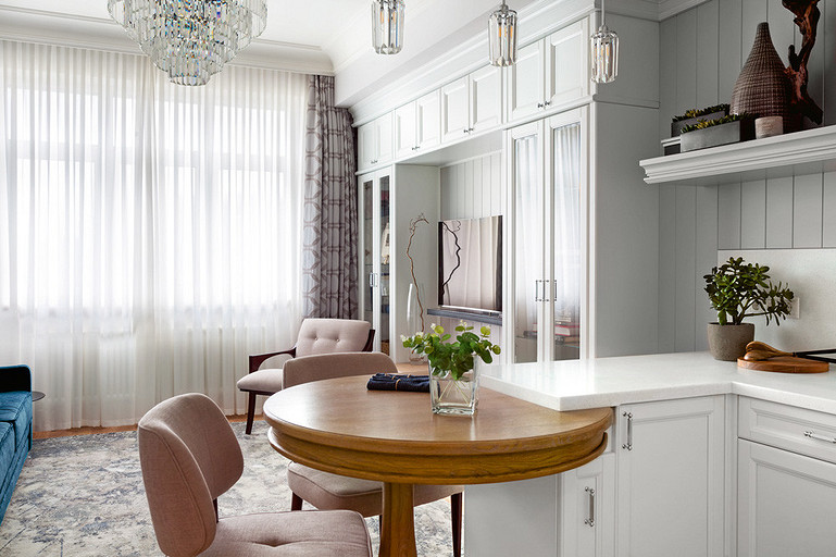 Хозяйка этой небольшой квартиры хотела получить праздничный, нарядный и уютный интерьер. Оттенки белого и выбранный стиль оформления, близкий к американской классике, помогли реализовать её мечту.
