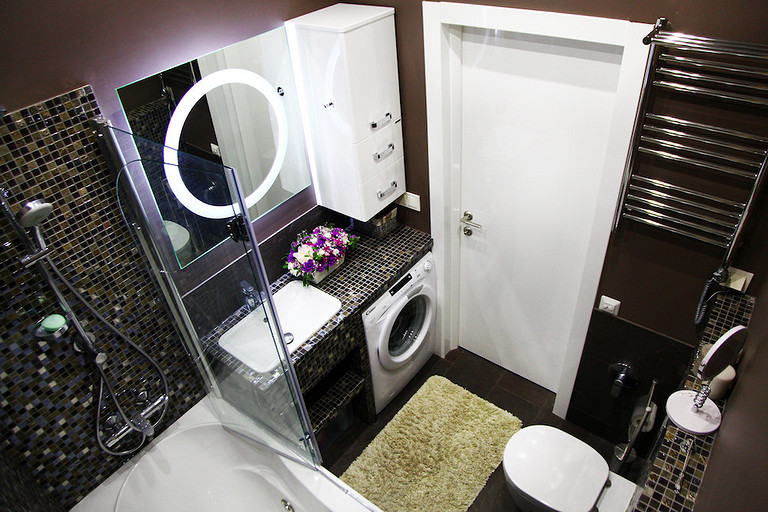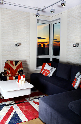Основной мотив дизайна квартиры — современный фьюжн с элементами минимализма и лофта. Но каждая комната оформлена по-своему: прихожая аскетична, кухня минималистична, гостиная — в британском стиле, спальня и детская — в современном, энергичный санузел и строгая ванная комната.