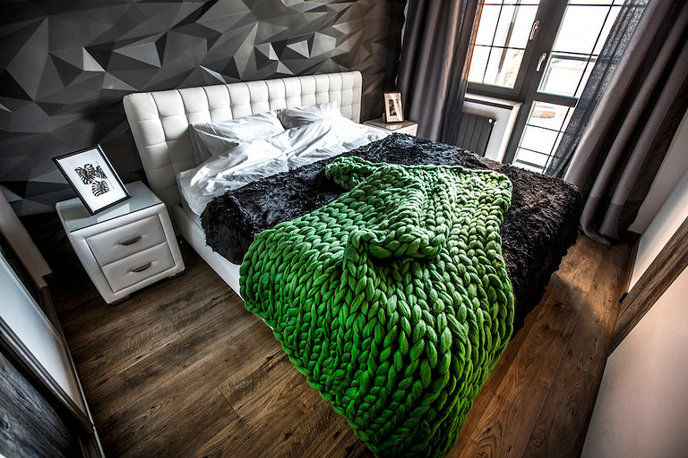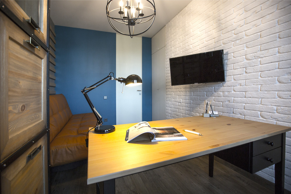 Для успешного молодого человека авторы проекта организовали в трёшке гостиную, кухню, столовую, спальню и кабинет. В основу оформления положен модный стиль лофт, дополненный ретро-деталями.