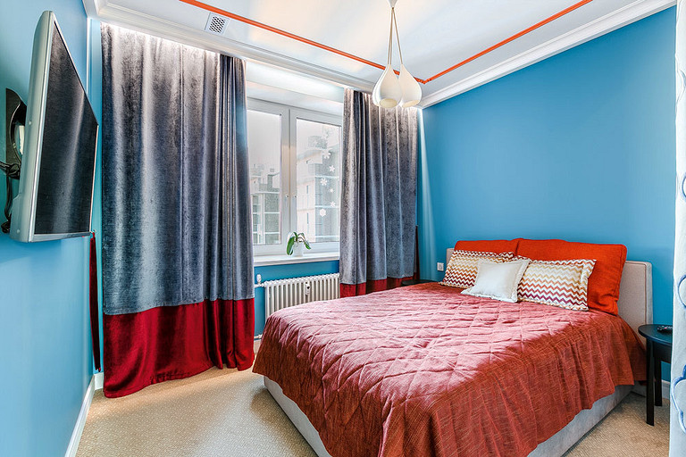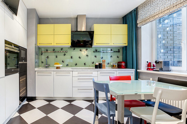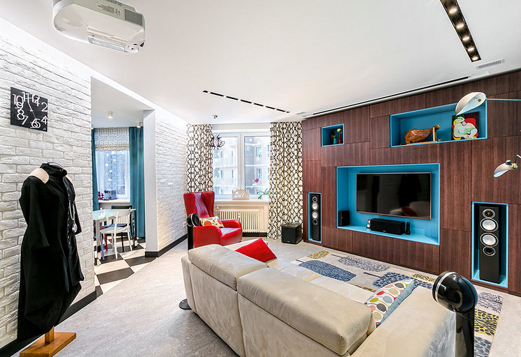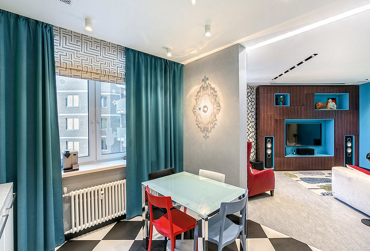 Из окон питерской квартиры, расположенной на 21-м этаже новостройки, открывается захватывающий вид на город. Красочной разноликой панораме вторит оптимистичный интерьер в стиле фьюжн с яркими хроматическими плоскостями.