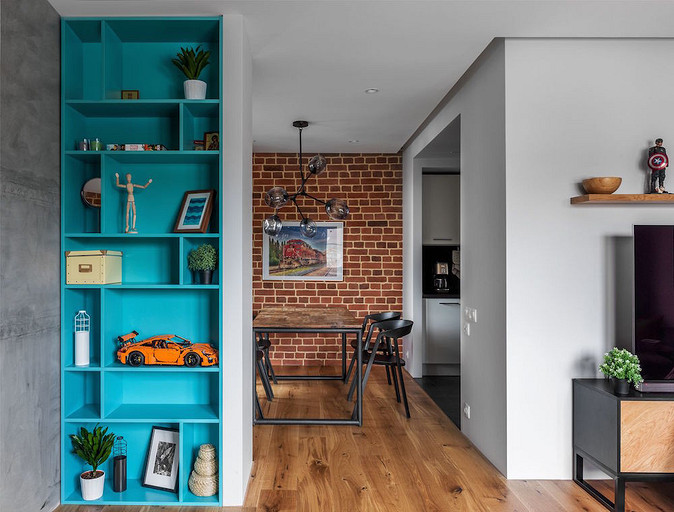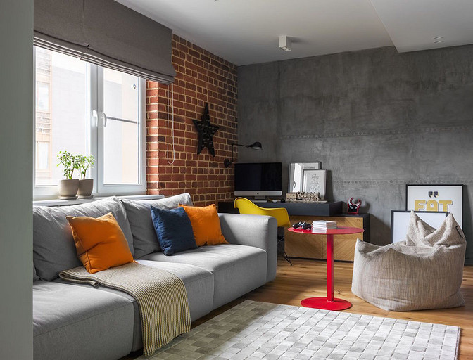 - Мебель: модельный диван Капри «Фабрика мебели 8 Марта», кресло-мешок Чушка L «Любовь архитектора» Smartballs, cтул у рабочего места Deep House, ТВ-тумба подвесная и стеллаж «Твой Цех»