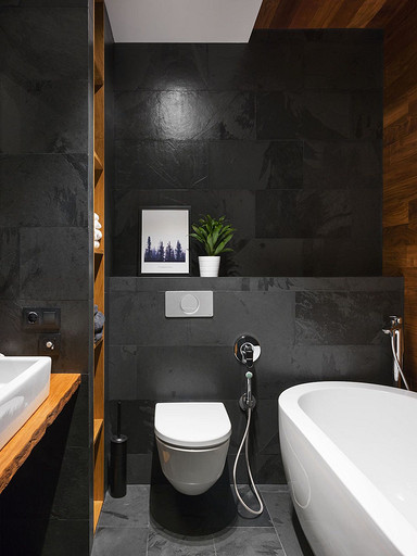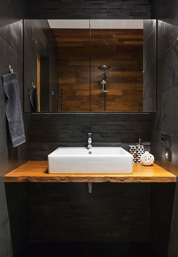 - Мебель: встроенный стеллаж, подвесной шкаф с зеркалом, столешница из тика под умывальник «Твой Цех»