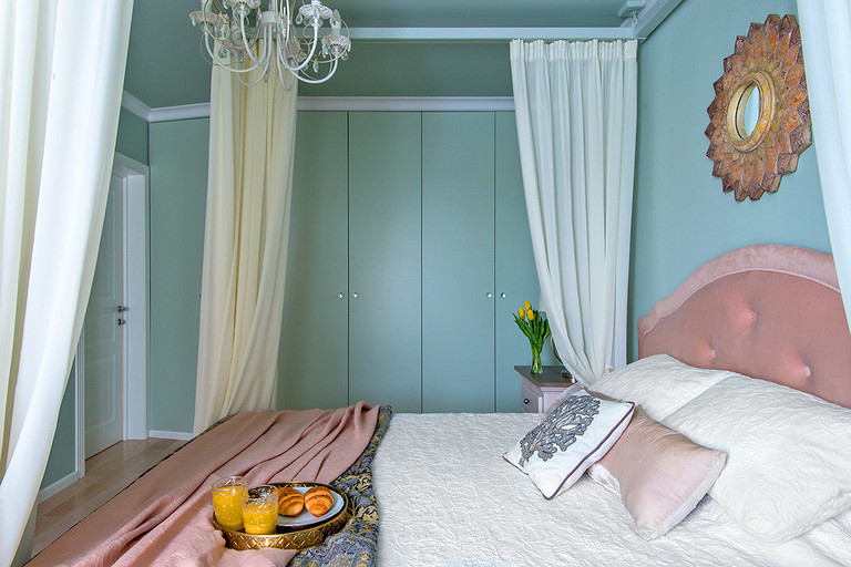 - Мебель: комод и тумба «СиВер», шкафы на заказ по эскизам автора проекта, изголовье кровати «Люксшторы»