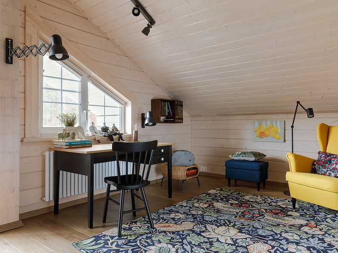 - Потолки: гипсокартон, сосновая вагонка, краска Derufa