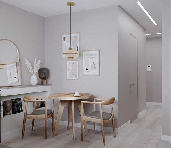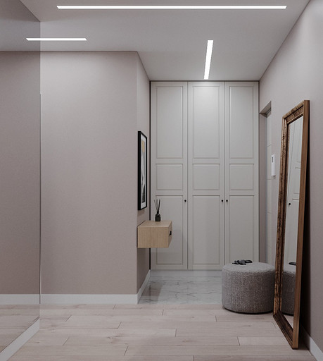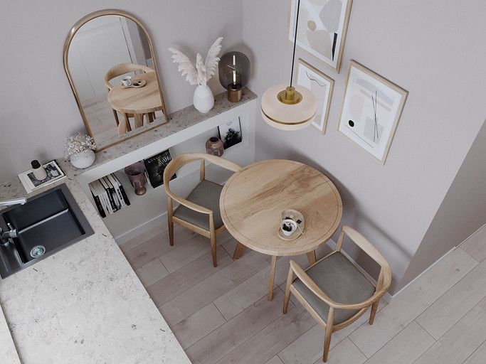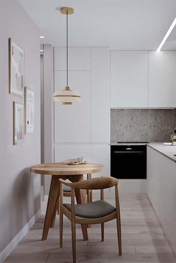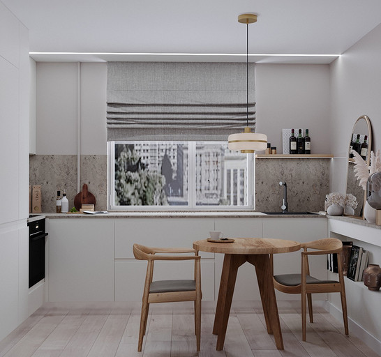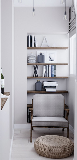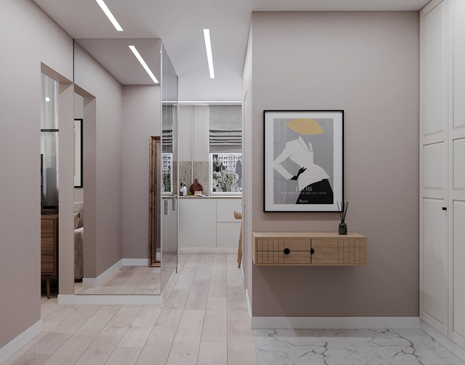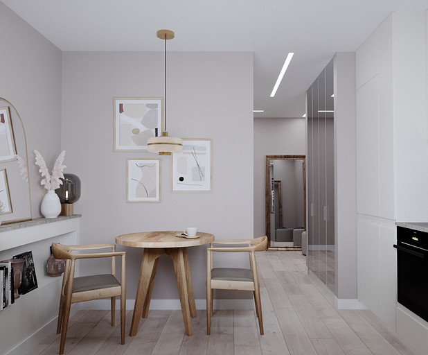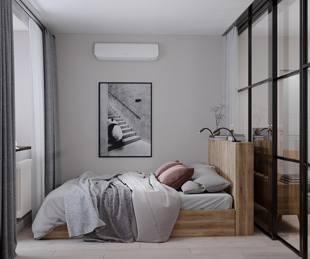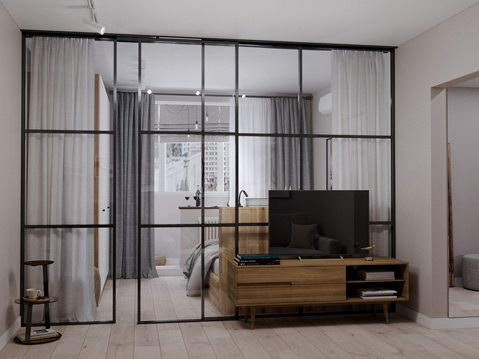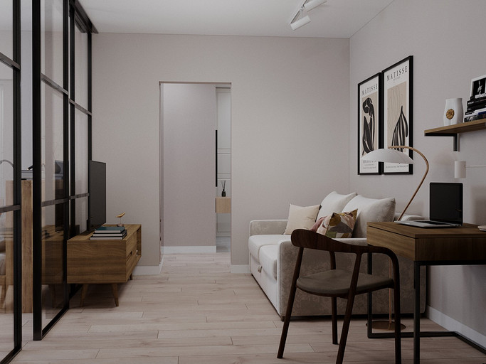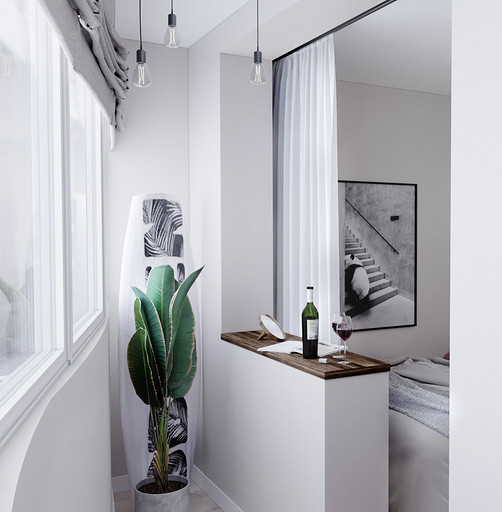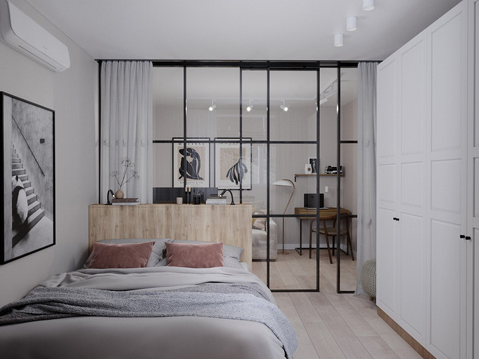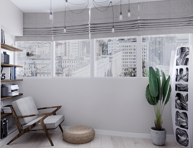 Общая площадь квартиры 40 кв.м. Мы сделали 4 планировочных решения и остановились на варианте с интересной кухней вдоль окна и зонированием одной большой комнаты на зону спальни с выходом на лоджию и гостиную с раскладным диваном и легкой лофт-перегородкой.
