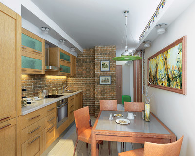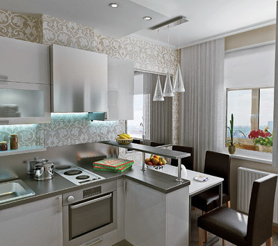 Морозно-белым стенам кухни добавляет тепла и домашнего уюта декоративная плитка под кирпич