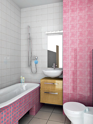Ванная облицована плиткой цвета фуксии с голубым цветочным рисунком, имеющим довольно легкомысленный вид, что несколько противоречит характеру интерьера