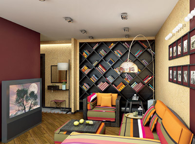 Решение расположить полки стеллажа по диагонали впервые предложено голливудским дизайнером. Авнизу сделано приспособление для комплекта видеоаппаратуры