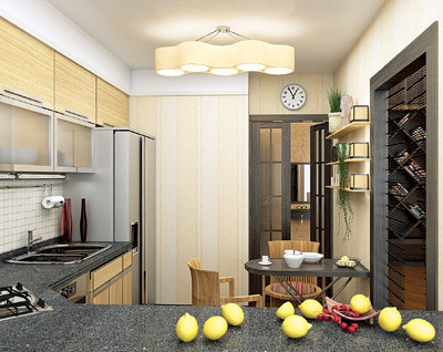 Над столиком для завтраков на длинных полках размещены обманки- «баночки для специй». На самом деле это светильники-кубы, которые «выдают себя» вечером