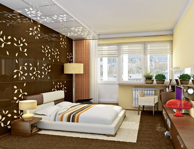 Стена в изголовье кровати покрыта необычным трехцветным растительным узором