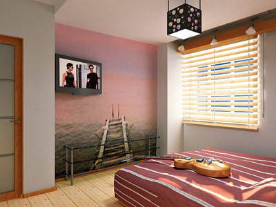 Уходящие вдаль мостки, водная гладь, линия горизонта, изображенные на фотообоях в нише,- динственный выразительный акцент небольшой комнаты