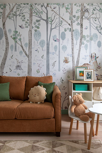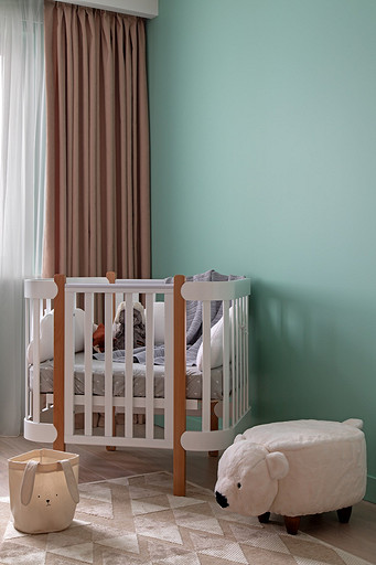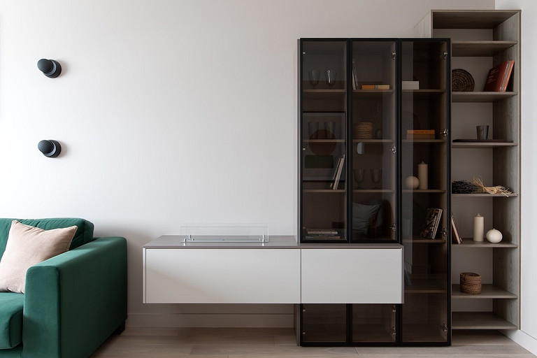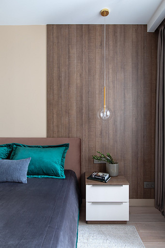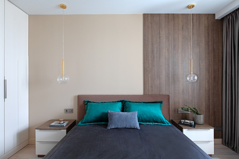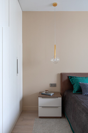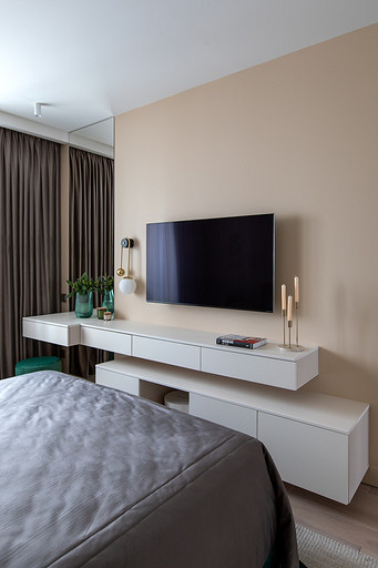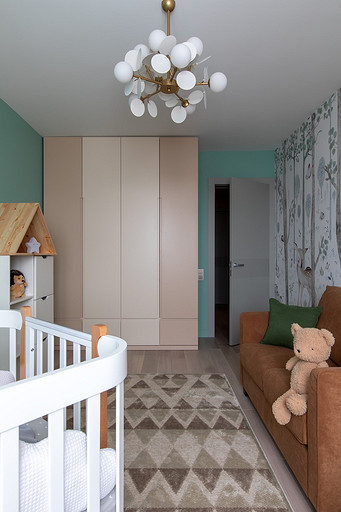 - Мебель: корпусная мебель сделана на заказ в «Кухни Сити», диван в гостиной и кровать «Эстетика»