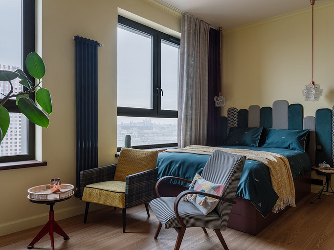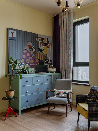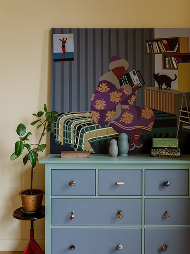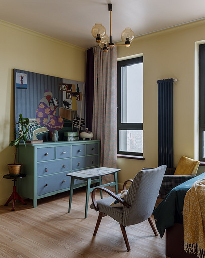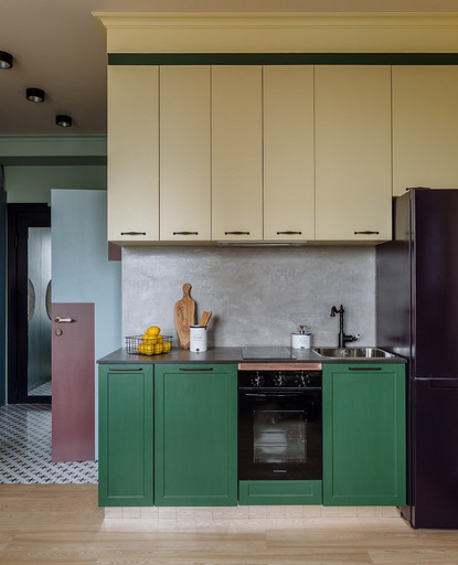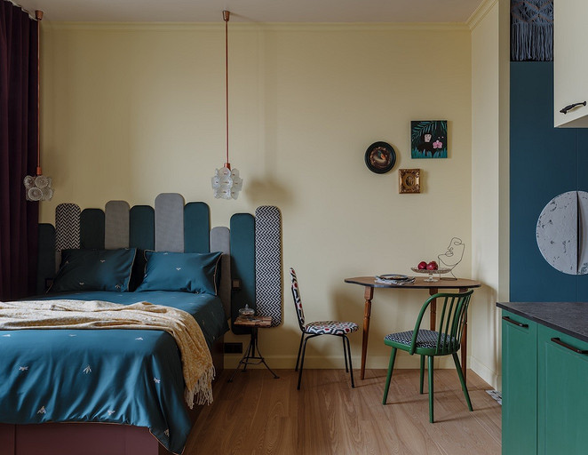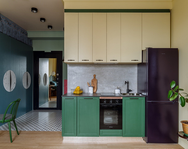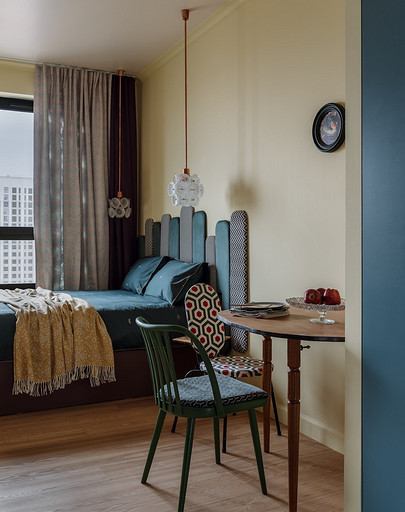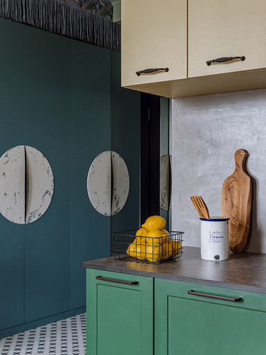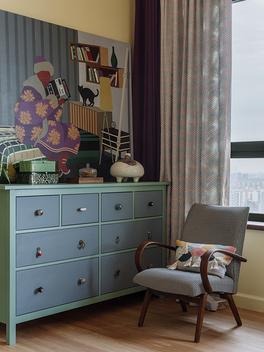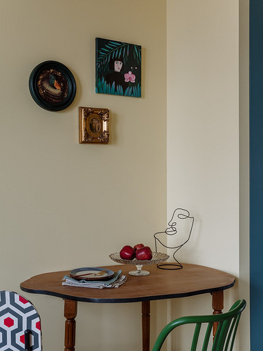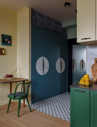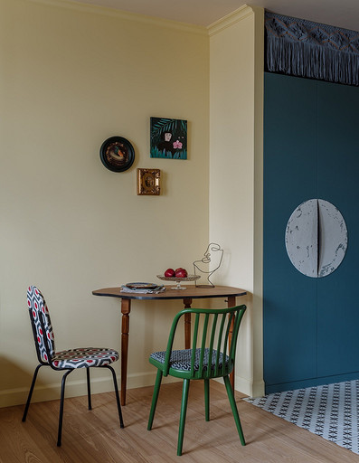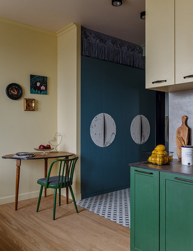 - Мебель: кровать, комод и шкаф в прихожей ИКЕА, кухня «Леруа Мерлен» (все окрашено краской Little Greene), стол, кресла, журнальный столик и стулья — советский винтаж, кастомизированный студией «Красят тут», обувница и шкаф в санузле сделаны на заказ