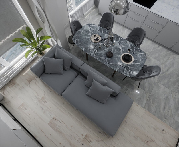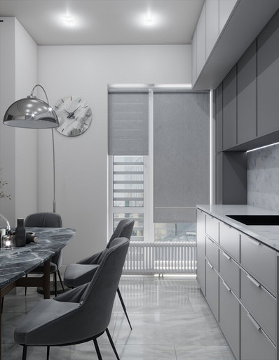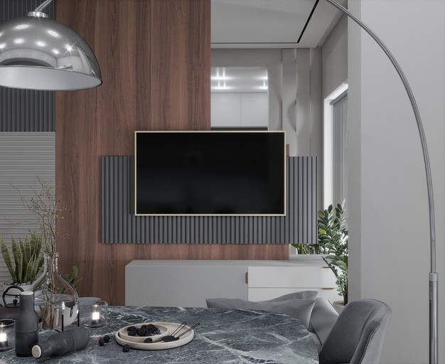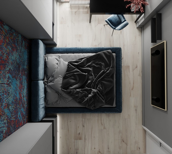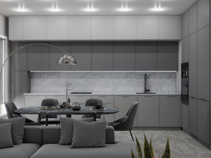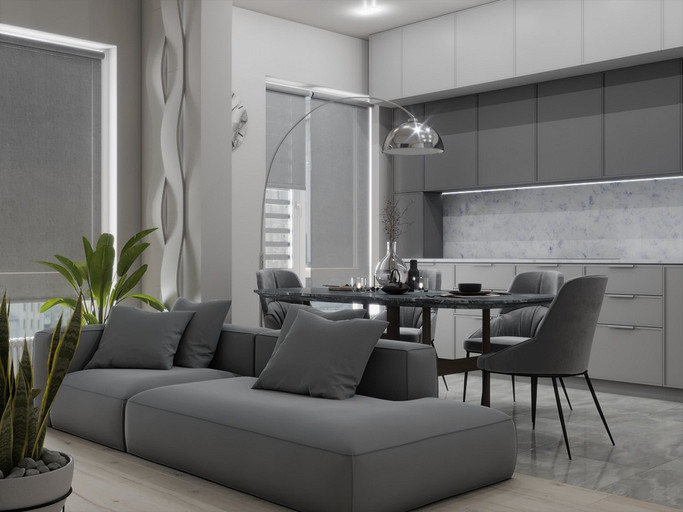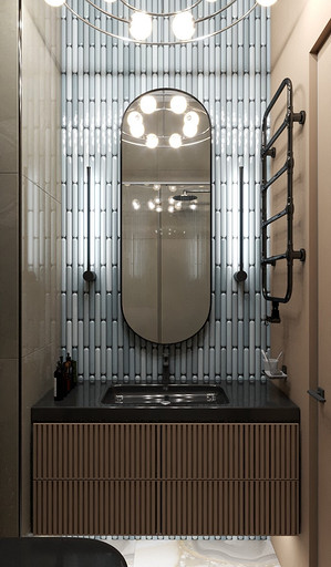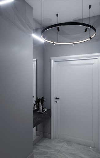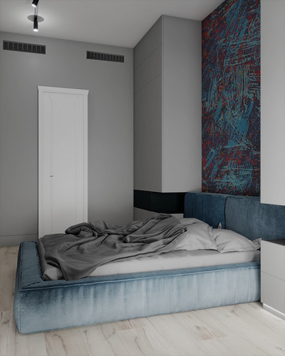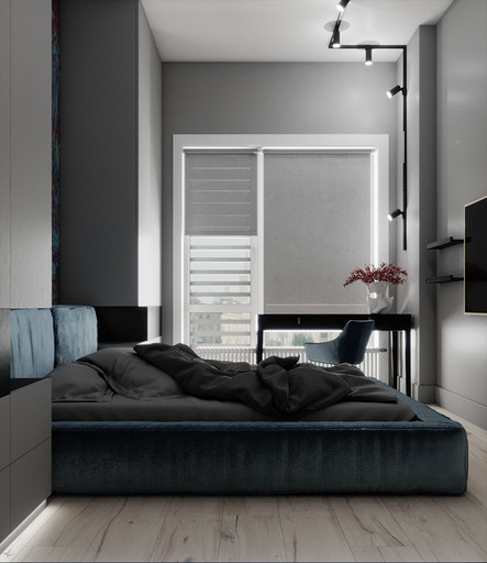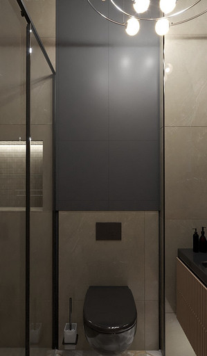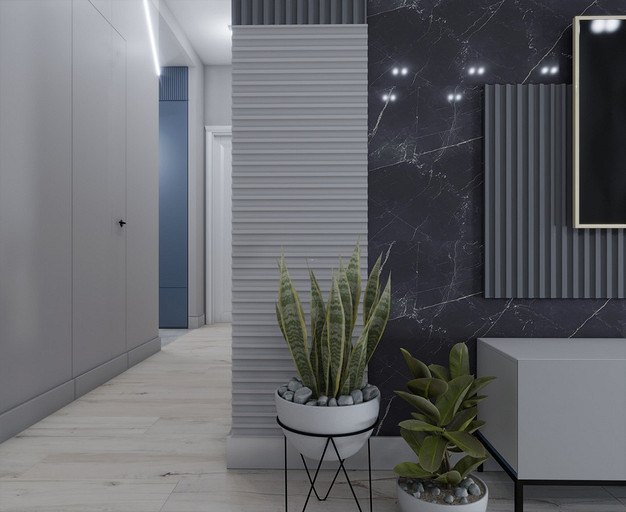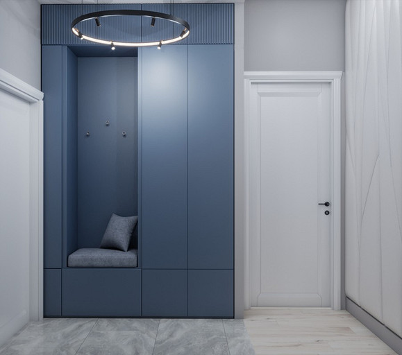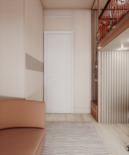 Заказчики — семейная пара с ребёнком (девочка). Предпочтения по дизайну: сочетание холодных серых и синих оттенков, строгий минималистичный дизайн, крупноформатный декор, визуально чистый и однородный интерьер без ярких акцентов. Девочке нравятся теплые «печеньковые» оттенки, в которых и была решена детская комната.