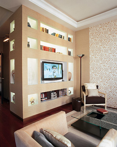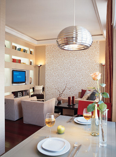 - Стены: гипсокартон, краска, обои текстильные Omexco