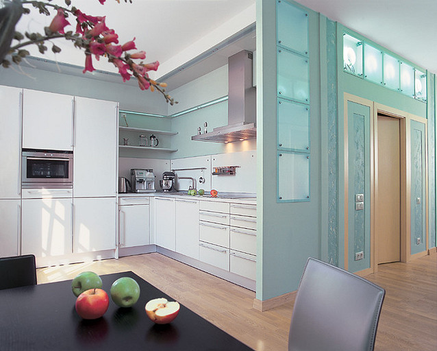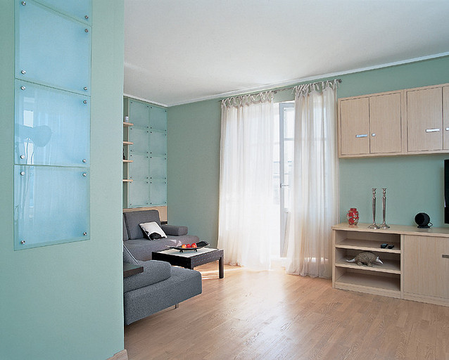 - Стены: перегородки монолитные железобетонные, гипсокартон на металлическом каркасе, краска Caparol