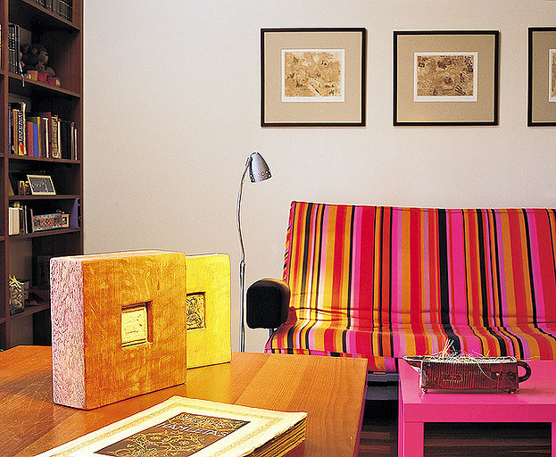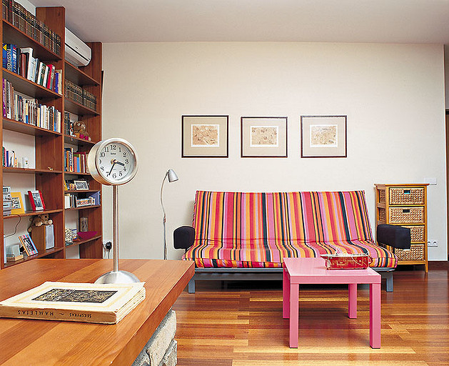 - Мебель: диван-кровать Innovation, столик розовый IKEA, столешница рабочего стола (сосна) на заказ, барная стойка (сосна) на заказ, стеллаж (сосна) на заказ