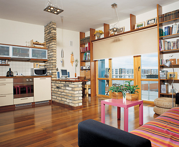 Вильнюсская однокомнатная квартира общей площадью 34 м2: студия включает кухню, столовую, спальню и гостиную, изолированной осталась только ванная.