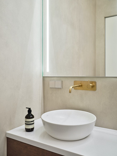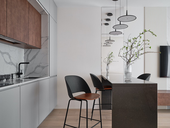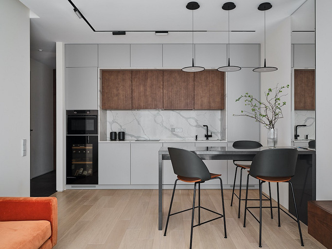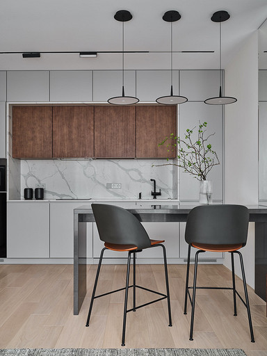 Кухня, гостиная (объединенные), спальня, гардеробная, постирочная — в этой квартире продумали все до мелочей и создали минималистичный, комфортный и функциональный интерьер для семейной пары. Читать далее...