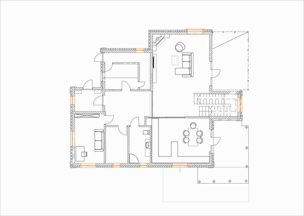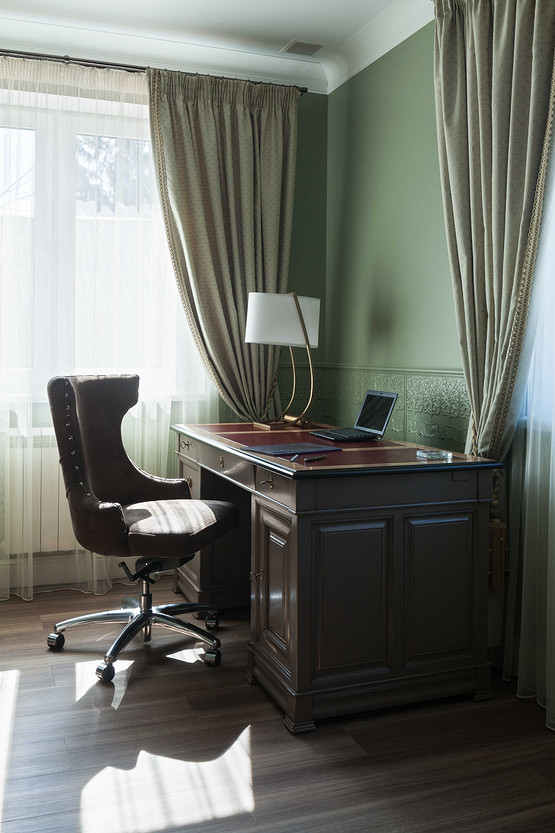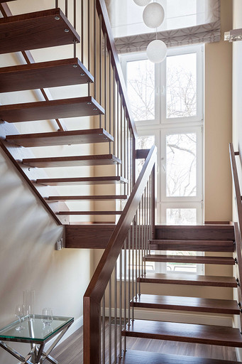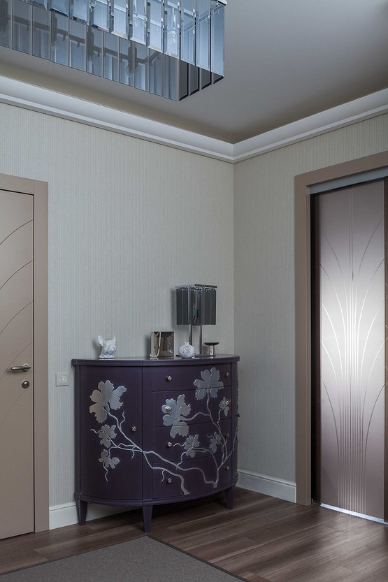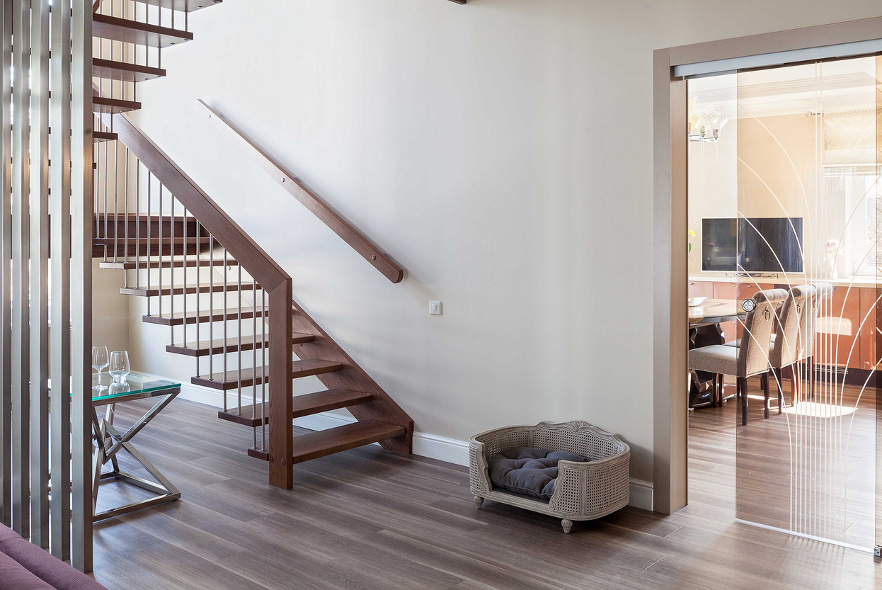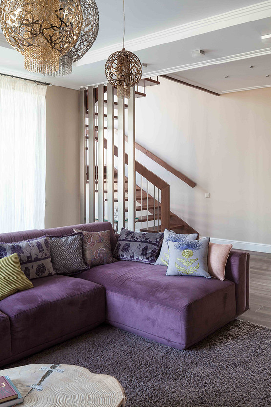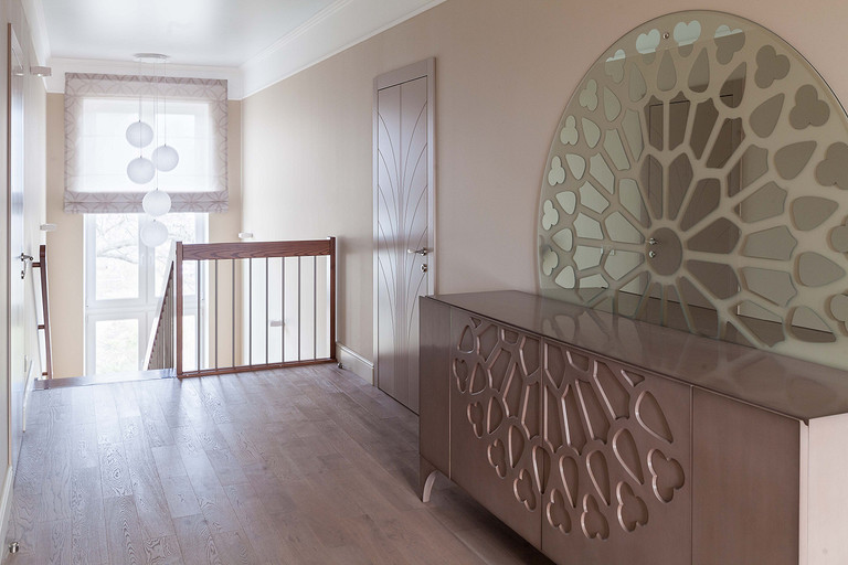 Частный дом в Орле площадью 250 м2. На первом этаже, помимо основных помещений, находится терраса и выход в зимний сад. На втором этаже – две спальни, гардероб и ванная комната. Много внимания было уделено созданию комфорта не только для хозяев, но и для их питомцев, главный из которых – французский бульдог Франк. Этим был обусловлен выбор некоторых решений на первом этаже: внутри всех открытых проемов первого этажа (между кухней и коридором, между холлом и гостиной) установили раздвижные стеклянные перегородки с рисунком, повторяющим рисунок дверей. Поэтому же на первом этаже использовали виниловое напольное покрытие вместо паркета и ковры из сизали. Интерьер всего дома решен в единой гамме, разнообразие вносят не только цветовые акценты, но и различные алгоритмы взаимодействия цвета, текстуры поверхностей и фактуры всех элементов интерьера. Относительная колористическая нейтральность основных плоскостей является фоном для тщательно выбранных предметов обстановки, подчеркивая их композиционную значимость.