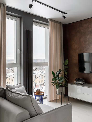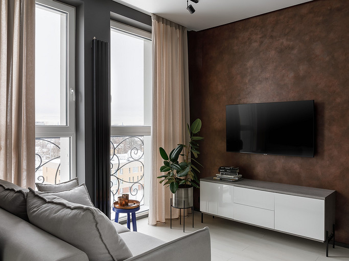 - Мебель: East Extension, тумба под ТВ Jysk, раскладной диван Aura Loft, стеллаж сделан на заказ