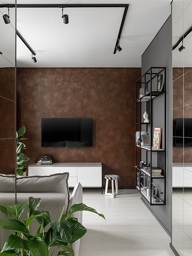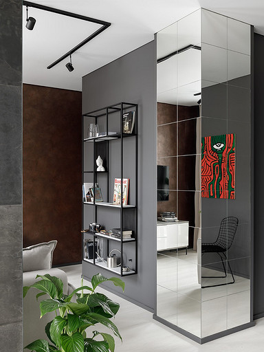 - Стены: каменный шпон Flat Stone, декоративная штукатурка Klondike Valpaint, зеркальные панели ИКЕА