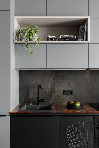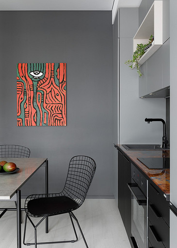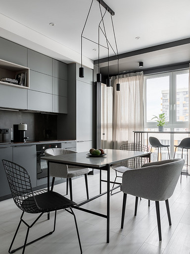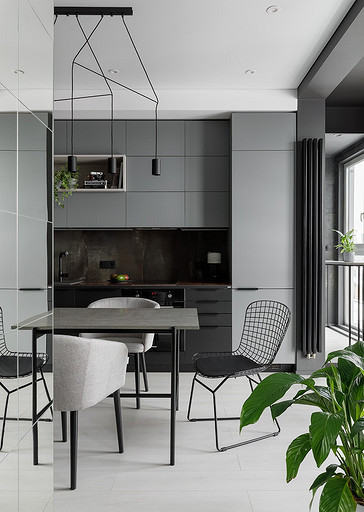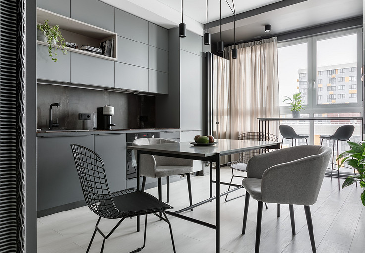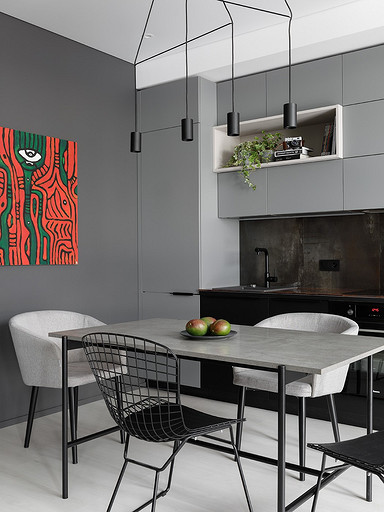 - Мебель: обеденный стол и барные стулья Jysk, столешница из закаленного стекла Ligron, шкафы и барная стойка сделаны на заказ в частной мастерской