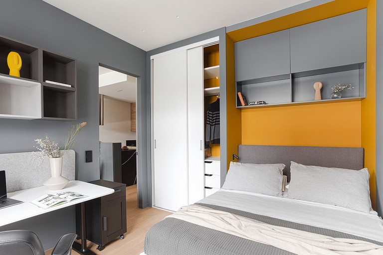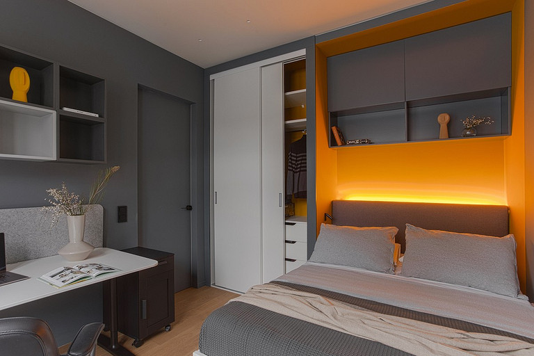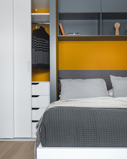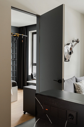 - Мебель: кровать, рабочий стол и стул ИКЕА, шкаф сделан на заказ (Mr. Doors), мягкое изголовье кровати — ателье Михаила и Оксаны Чалян