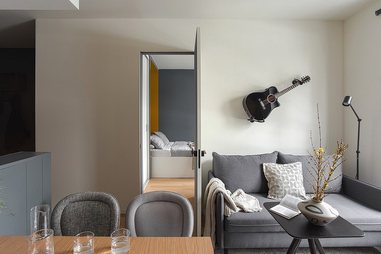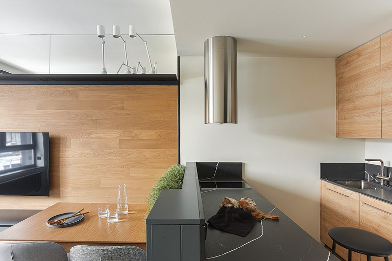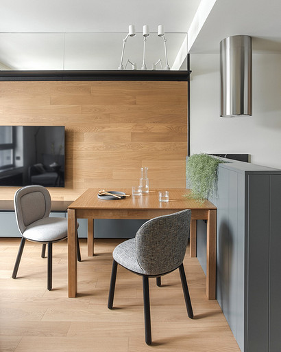- Мебель: диван RM Home, столик и стулья Chair Сollections, корпусная мебель и декоративные панели сделаны на заказ по эскизам дизайнера